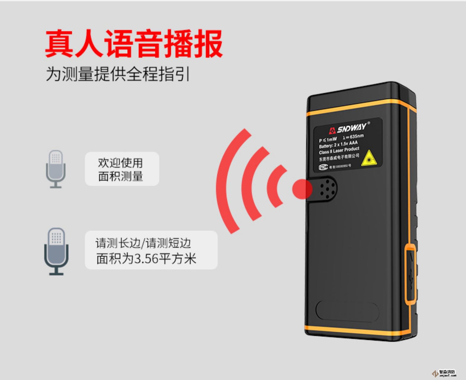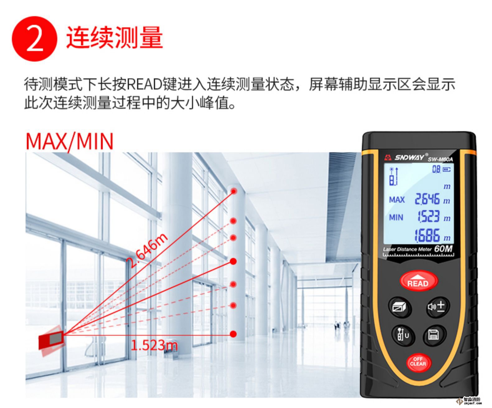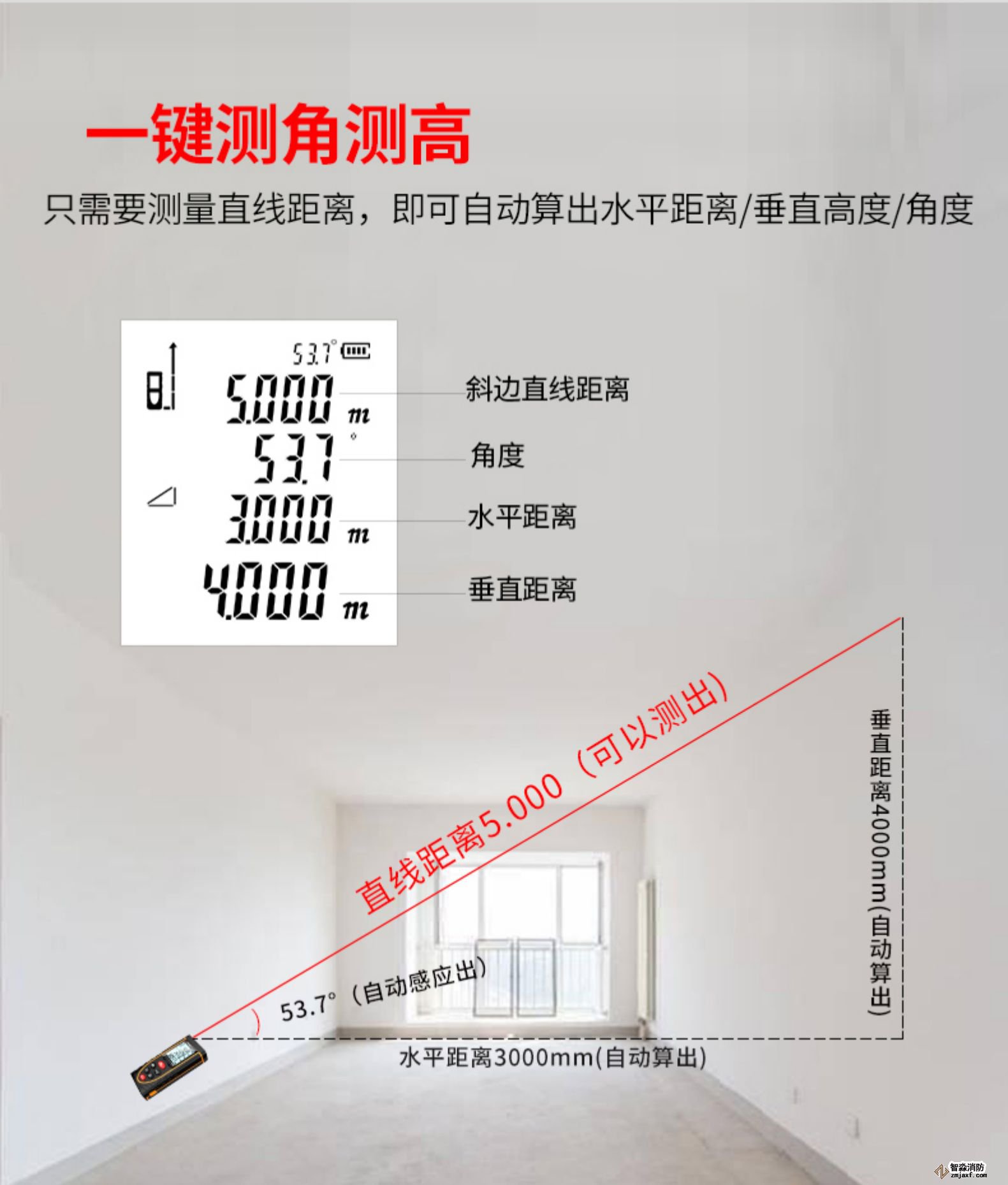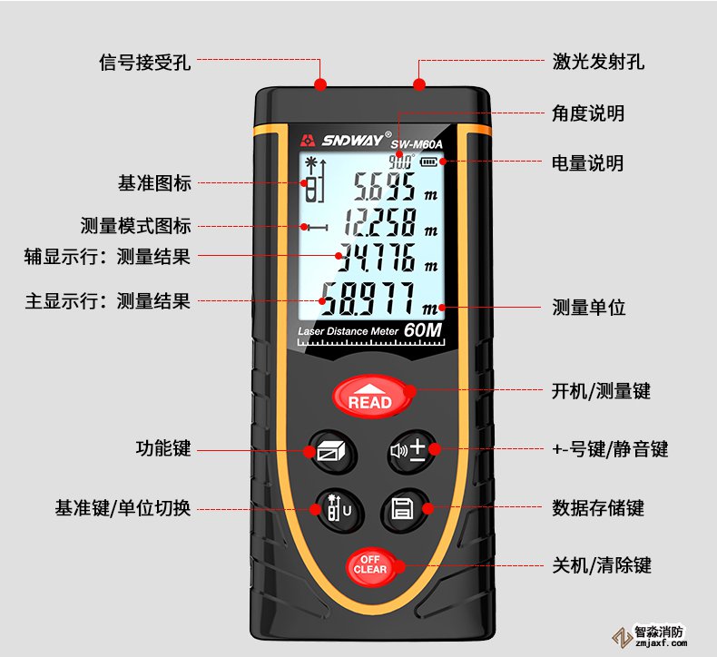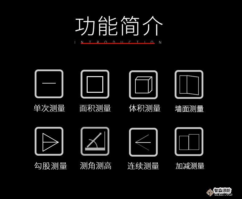 激光測距儀量程不小于50m;精度:3mm測量距離、面積、空間、體積