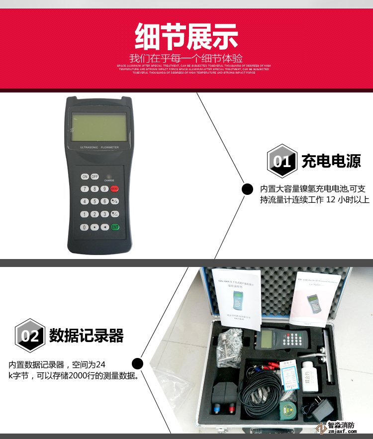 手持式超聲波流量計。其測量管徑在0-700mm,精度±1%。
