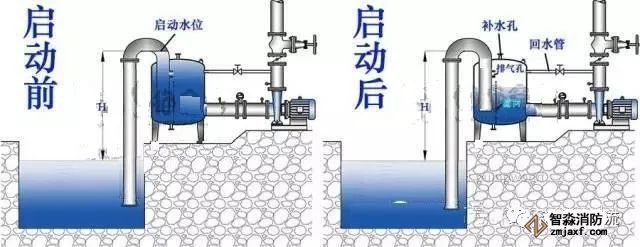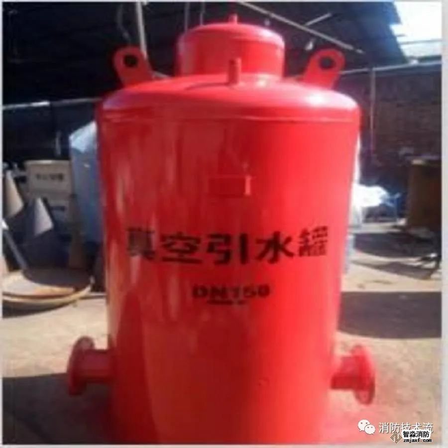 一些老舊建筑的改造,受面積或位置原因導致消防水泵不能實現自灌式吸水,比如消防水泵只能安裝在消防水池的上蓋,此時水泵的吸水管只能向下伸入水池的水位中,造成吸水管一段管道無水,這種情況消防水泵在啟動時不能吸上水,而這樣的例子并不少見,以下介紹的真空罐(也稱負壓罐)是解決這個問題的一種方式。