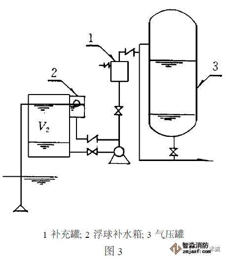 如圖三所示, 當補氣罐及水泵出水管上止回閥以前的管道水容積較小時(小于真空罐容積V2時)停泵后,在補氣罐補氣過程中,外界空氣有可能進入真空罐,破壞了真空度,待下次啟泵時不出水。這種情況在實際工程中曾發生過,后將補氣罐容積加大而解決。解決方法可適當加大補氣罐容積或增加一個浮球式補水箱。