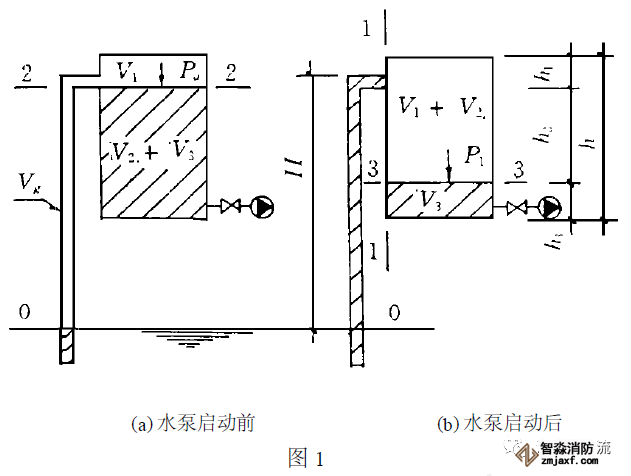 水泵啟動前,真空引水罐內的水應灌至真空引水罐能做到的大存水量,此時罐內部由水+空氣兩部分構成,液面上方的氣體容積為V1。罐內外的壓力與大氣壓力Pa相同。