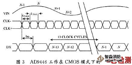 AD9446芯片的控制時(shí)序與傳統(tǒng)的低速A/D有所不同,它完全依靠時(shí)鐘來控制其采樣、轉(zhuǎn)換和數(shù)據(jù)輸出。AD9446通常在CLK第一個(gè)時(shí)鐘的上升沿開始采樣轉(zhuǎn)換,并在經(jīng)過延遲tpd后,開始輸出數(shù)據(jù)。而數(shù)據(jù)則在第13個(gè)時(shí)鐘到來時(shí)才出現(xiàn)在D15~D0端口上。圖3是AD9446工作在CMOS模式下的時(shí)序圖。