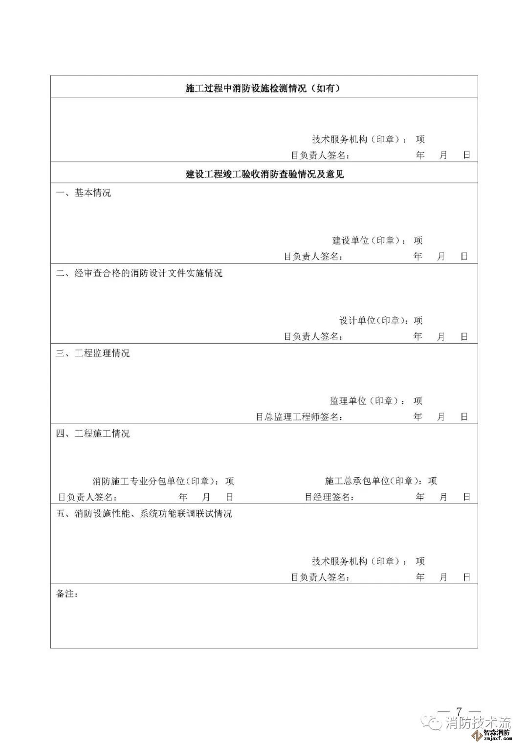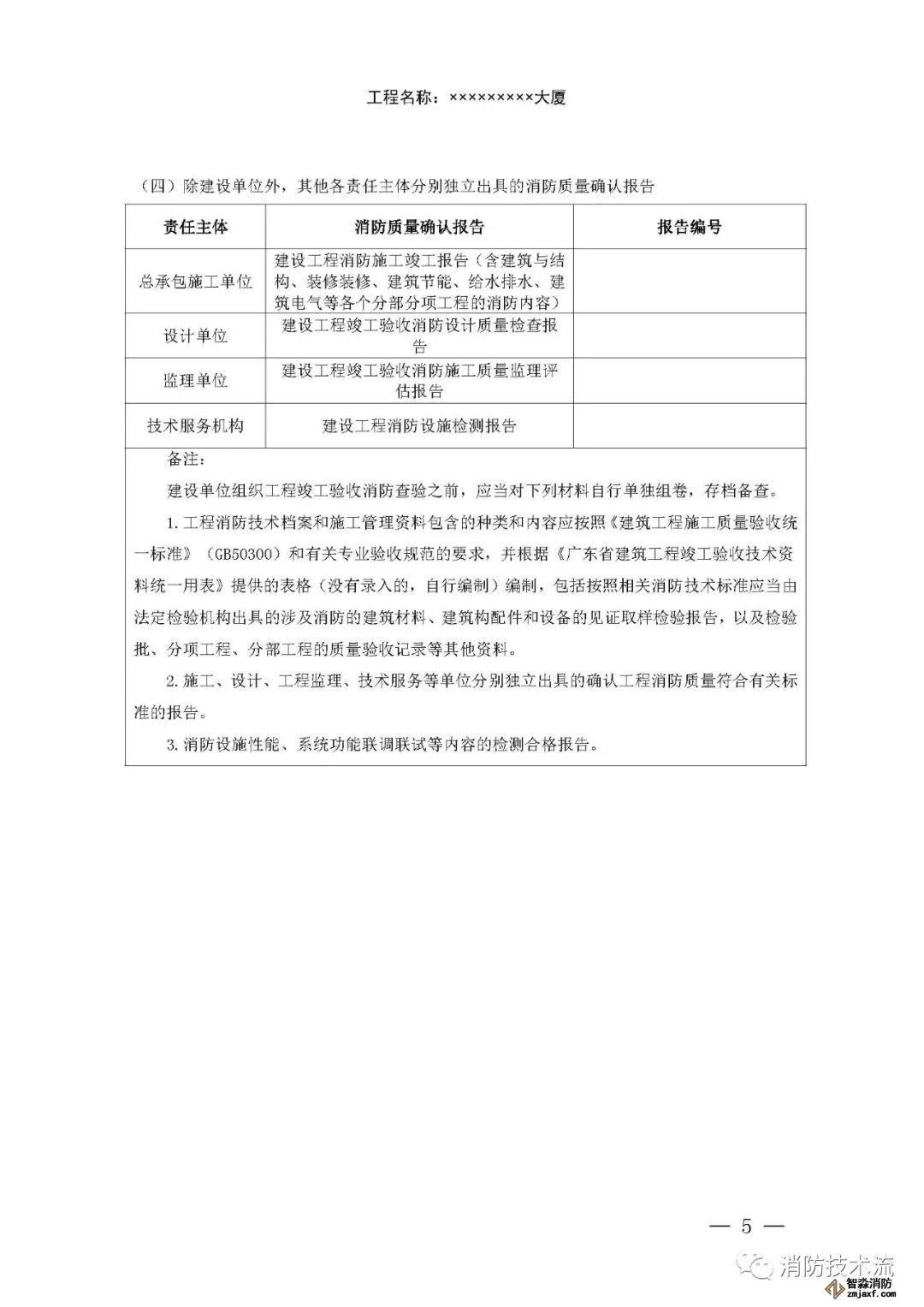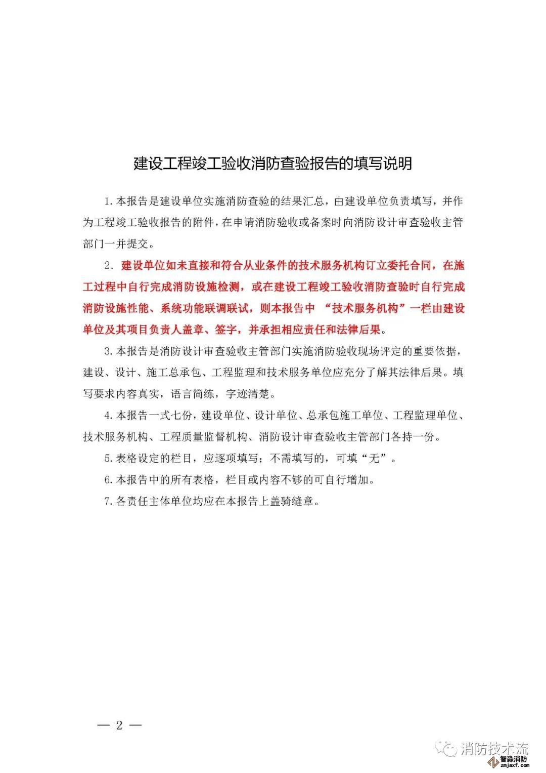 其中附件2和附件5中的填表說明均表示: 建設單位如未直接和符合從業條件的技術服務機構訂立委托合同,在施工過程中自行完成消防設施檢測,或在建設工程竣工驗收消防查驗時自行完成中 消防設施性能、系統功能聯調聯試,則本報告中 “ 技術服務機構 ” 一欄由建設單位及其項目負責人蓋章、簽字,并承擔相應責任和法律后果。